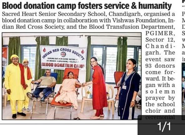 93 units of blood collected at Sacred Heart Senior Secondary School Chandigarh. In a noble cause to promote the spirit of service and humanity, Sacred Heart Senior Secondary School, Chandigarh, in collaboration with Vishwas Foundation, Indian Red Cross Society, Chandigarh and the Blood Transfusion Department of PGIMER, Chandigarh, organized a blood donation camp. The event received an overwhelming response, with 93 blood donors coming forward to save lives. ll the donors were honoured by Red Cross Society's nodal officer Poonam Malik by giving them certificates of appreciation. The program began with a solemn prayer by the school choir, which set a calm and compassionate atmosphere for the day. This was followed by the School Manager, Reverend Sister Anupa; Principal, Reverend Sister Venita; Vice Principal, Sister Usha; Dr. Sangeeta, Associate Professor, Department of Transfusion Medicine, PGI; Sadhvi Neelima Vishwas, President of Vishwas Foundation; and The ceremonial lamp was lit by parent representatives. In her welcome address, Rev. Sr. Venita expressed gratitude to all the partner organizations for their invaluable support in making the camp a success. She emphasized the importance of nurturing compassion and social responsibility in students and said that such initiatives help young minds understand the value of selfless service. The school choir gave a moving performance on the theme of humanity and solidarity, filling the atmosphere with emotion and positivity. A short motivational speech was delivered, encouraging voluntary blood donation as a civic duty that can save countless lives. The PGIMER medical team, in collaboration with volunteers from the Indian Red Cross Society and the Vishwas Foundation, ensured the smooth and safe collection of blood units. Strict medical standards were followed throughout the process, with doctors and trained nurses monitoring each step. Refreshments were provided to ensure the comfort and well-being of blood donors.And arrangements were made for rest.In gratitude, tokens of appreciation were presented to the Vishwas Foundation for their organizational support and to Dr. Sangeeta for her professional guidance and contributions. Both were commended for their continued efforts to promote voluntary blood donation campaigns throughout the region. Dr. Sangeeta appreciated the enthusiasm of the blood donors and praised the school for instilling social awareness among the students. Vishwas Foundation also commended the school management and volunteers for their dedication in effectively coordinating the event. The camp concluded with satisfaction and gratitude as teachers, parents, and alumni joined hands for humanity. The successful collection of 93 units of blood was a testament to the collective effort of the school community and its commitment to social welfare. This initiative by Sacred Heart Senior Secondary School once again reaffirmed its mission to educate hearts and minds.