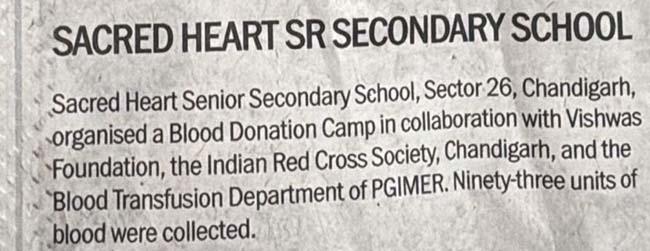 Sacred Heart Senior Secondary School, Sec-26, Chd, organized a Blood Donation Camp in collaboration with Vishwas Foundation, the Indian Red Cross Society, Chandigarh, and the Blood Transfusion Department of PGIMER. Ninety three units of blood were collected.