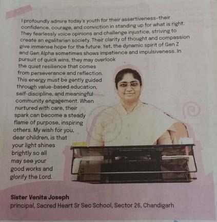 I profoundly admire today’s youth for their assertiveness-their confidence, and conviction in standing up for what is right. They fearlessly voice opinions and challenge injustices, striving to create an egalitarian society. Their clarity of thought and compassion give immense hope for the future. Yet, the dynamic spirit of Gen Z and Gen Alpha sometimes shows impatience and impulsiveness. In pursuit of quick wins, they may overlook the quiet resilience that comes from perseverance and reflection. This energy must be gently guided through value-based education, self-discipline, and meaningful community engagement. When nurtured with care, their spark can became a steady flame of purpose, inspiring others. My wish for you, dear children, is that your light shines brightly so all may see your good works and glorify the Lord.