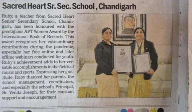 Ruby, a teacher from Sacred Heart Senior Secondary School, Chandigarh, has been honoured with the prestigious APT Women Award by the International Book of Records. This award recognises her extraordinary contributions during the pandemic, especially her free online and later offline webinars conducted for youth. Ruby’s achievement adds to her versatile accomplishments in the fields of music and sports. Expressing her gratitude, Ruby thanked her parents, the school management, coordinators, and especially the school’s Principal, Sr. Venita Joseph, for their constant support and encouragement.
