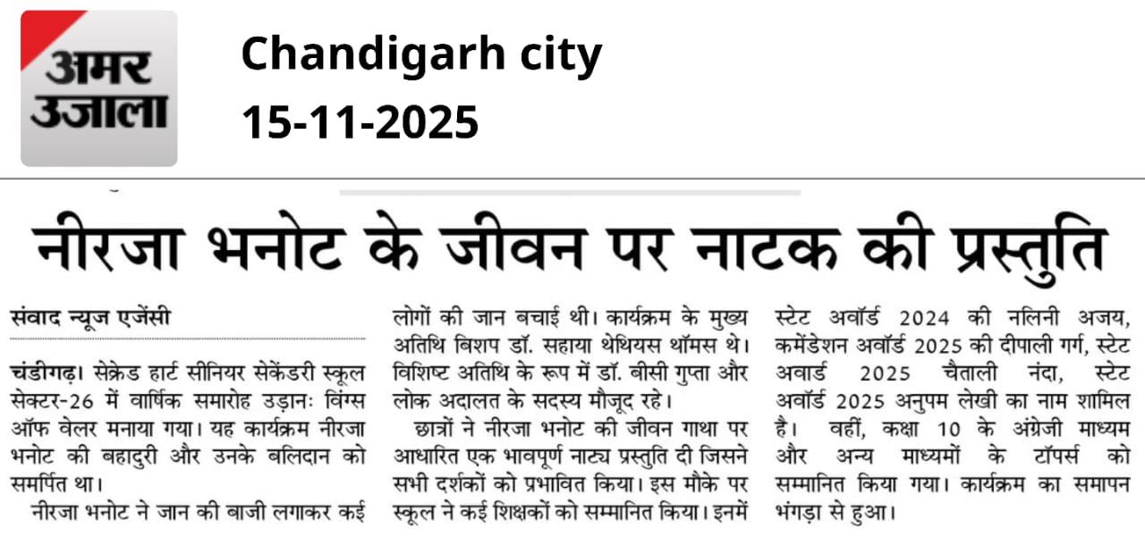 The annual function Udann: Wings of Valor was celebrated at Sacred Heart Senior Secondary School, Sector-26. The program was dedicated to the bravery and sacrifice of Neerja Bhanot. Neerja Bhanot saved the lives of many people by risking her own life. The chief guest of the program was Bishop Dr. Sahay Thaverne Shams. The special guests included Dr. Bansi Gupta and members of the local court. The students presented an emotional play based on the life story of Neerja Bhanot, which deeply moved all the viewers. On this occasion, the school honored several teachers. These included Nalini Ajay, who received the State Award 2024; Deepali Garg, who received the Commendation Award 2025; Chetali Nanda, recipient of the State Award 2025; and Anupam Lekhi, recipient of the State Award 2025. Along with this, toppers of class 10 in English medium and other streams were also honored. The program concluded with a vibrant bhangra performance.