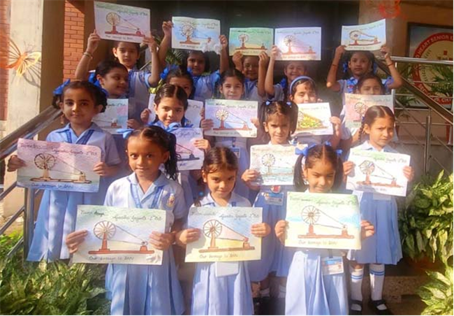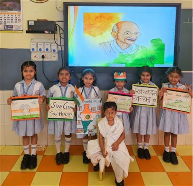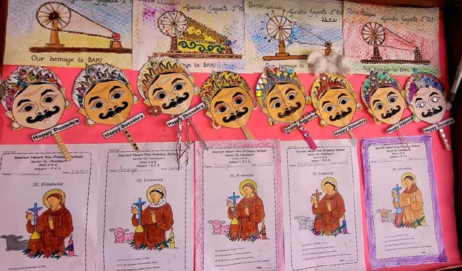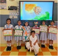 UKG children celebrated Gandhi Jayanti and Dussehra with great joy and creativity. For Gandhi Jayanti, they joined dots to draw a charkha, coloured worksheets of Gandhiji, and proudly presented their colourful charkhas as a tribute to the Father of the Nation.